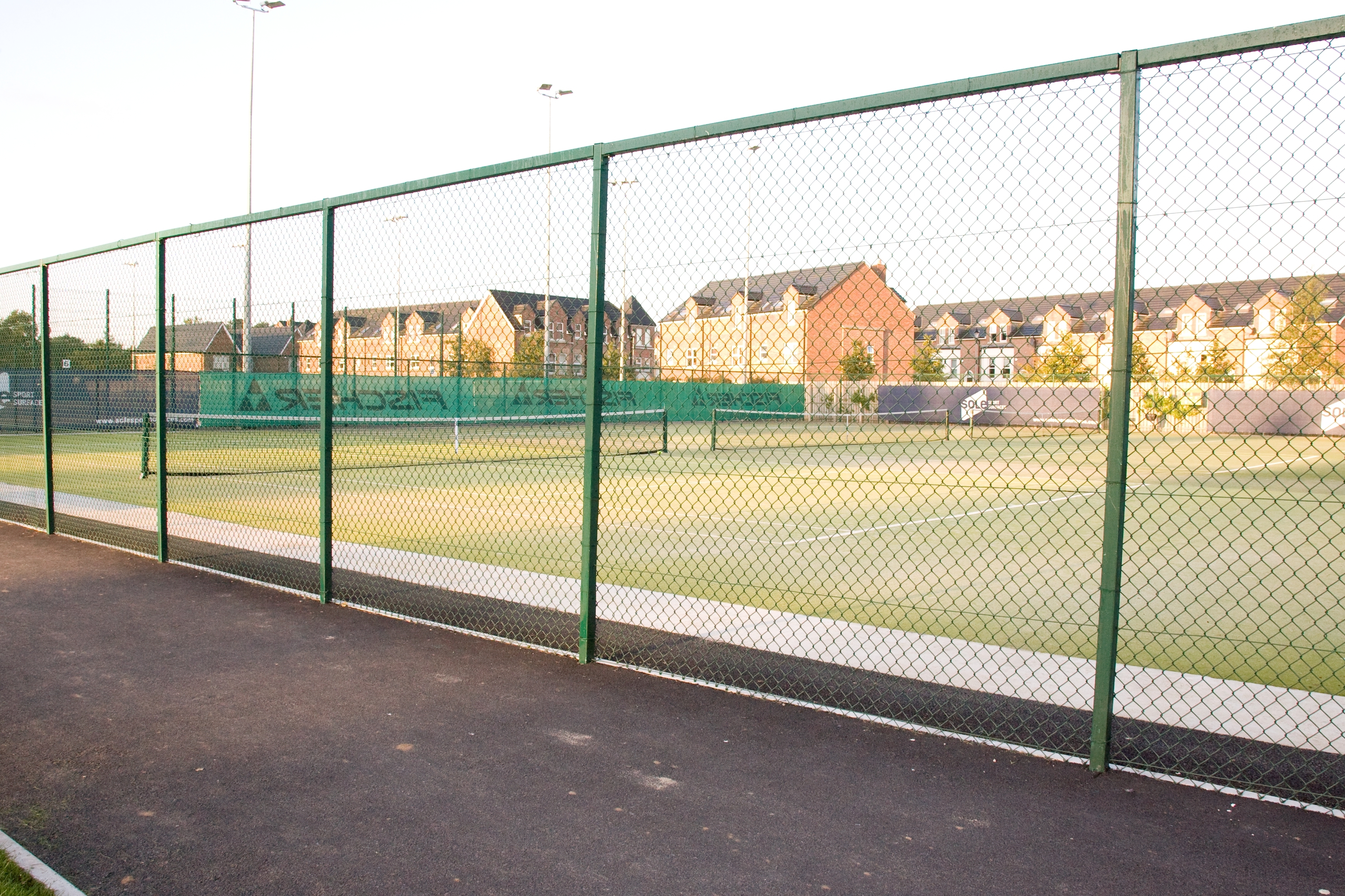 NK Sports Tennis Court system comprising galvanised and polyester powder coated RHS fence posts clad with 2.75m PVC coated chainlink complete with flush mounted gates.